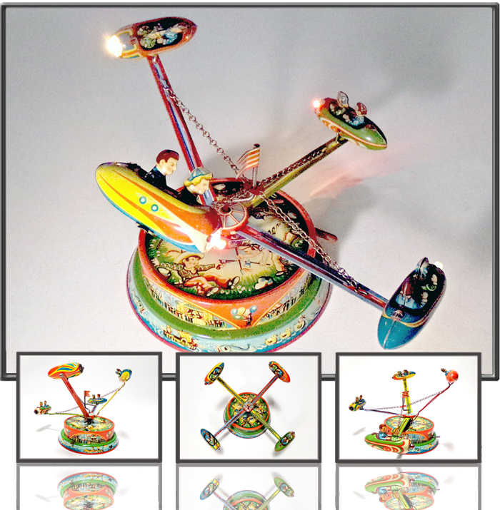 Rocket gondola ride made by Blommer & Schüler, Western Germany, 1960s Merry go round with rockets with battery lights Clockwork Ø130mm.Z-2 |